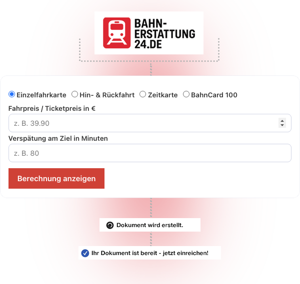 Sie erhalten von uns ein professionell vorbereitetes Dokumentenset, mit dem Sie Ihren Antrag selbst direkt bei der Bahn einreichen. Die Entscheidung über eine Auszahlung liegt allein beim Bahnunternehmen.
